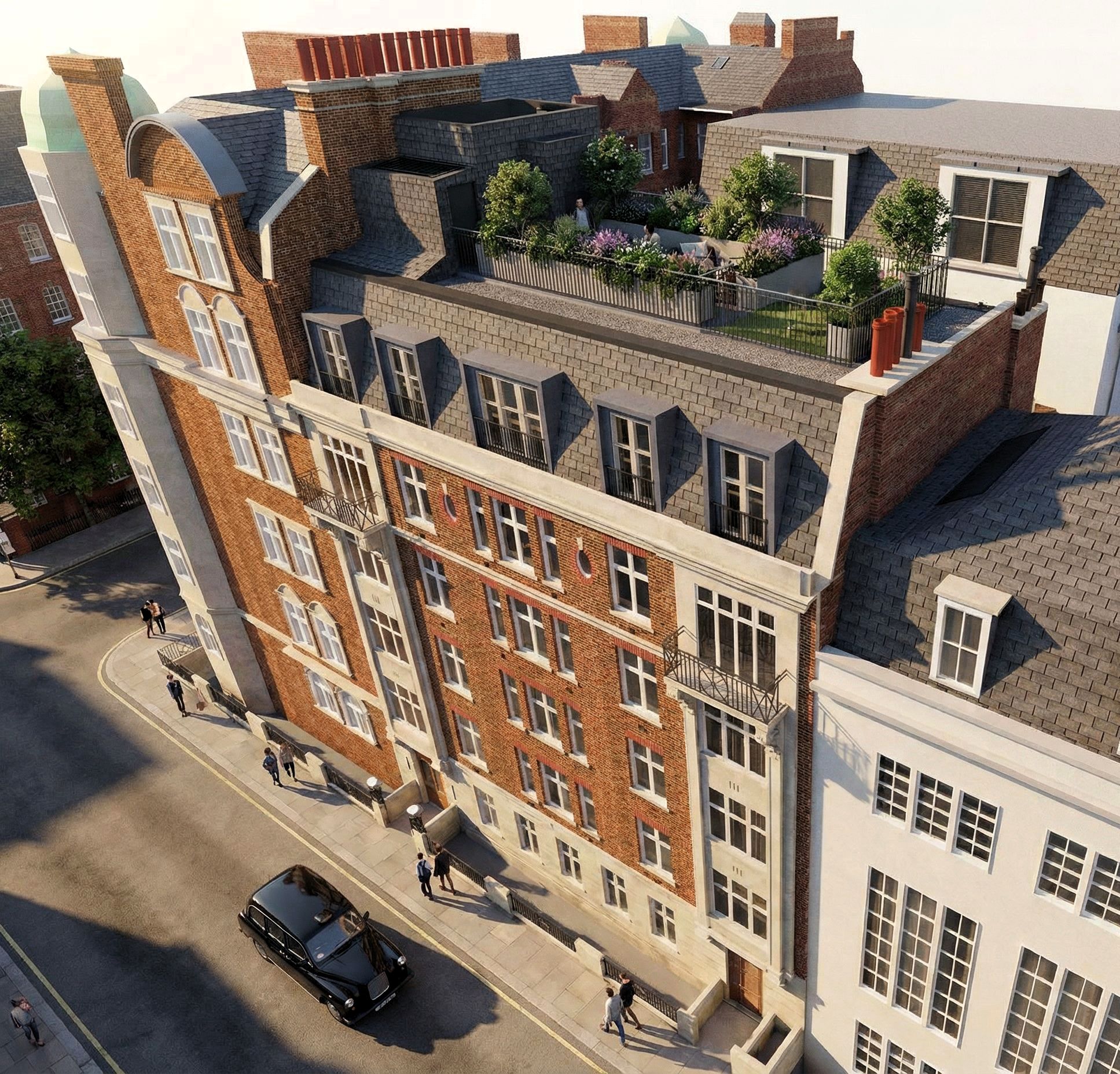 The scheme involves the conversion of an existing office building into residential usage via Permitted Development alongside a roof extension and new roof terrace via Planning Approval and Listed Building consent.